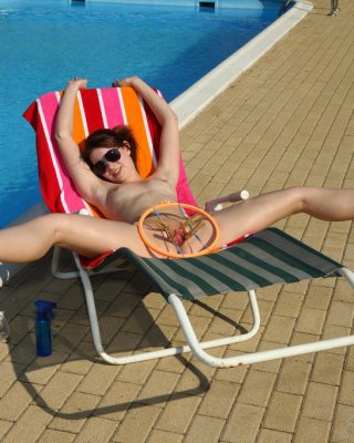 Judy Smile bikini brunette strips posing her pussy