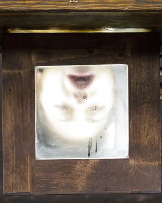Tattooed model Dahlia Sky hung upside down with head in bondage box