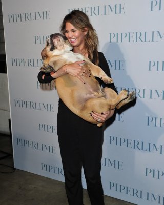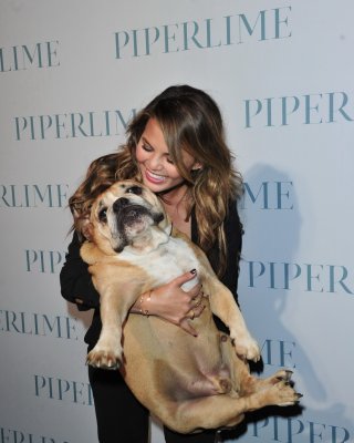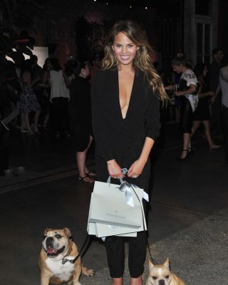Chrissy Teigen braless cleavy petting two ugly bulldogs at the new Piperlime co