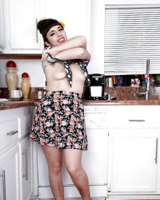 Sexy brunette teen Night A showing off tits, ass and twat in black nylons