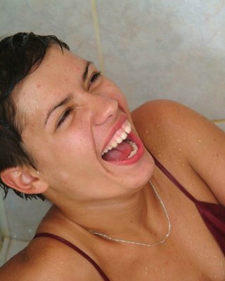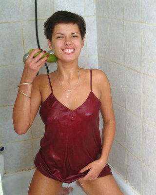 showering hairy brunette has some fun with her favorite cucumber