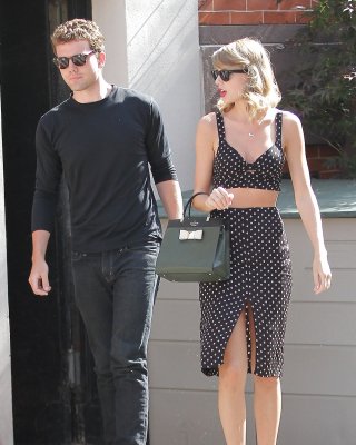 Taylor Swift busty and leggy in short black skirt and tight bareback top out for